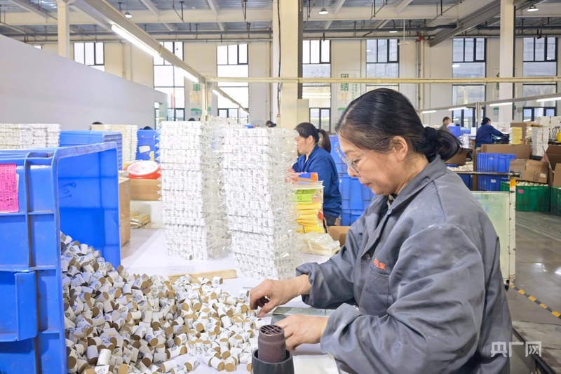 工人在对生产好的艾柱包装(央广网记者 张羲轮 摄)